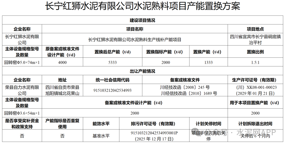 長(zhǎng)寧紅獅水泥4000t/d熟料生產(chǎn)線補(bǔ)充1333t/d產(chǎn)能,補(bǔ)充后產(chǎn)能為5333t/d,出讓產(chǎn)能來(lái)自榮縣自力水泥有限公司一條2000t/d熟料線,置換比例1.5:1。