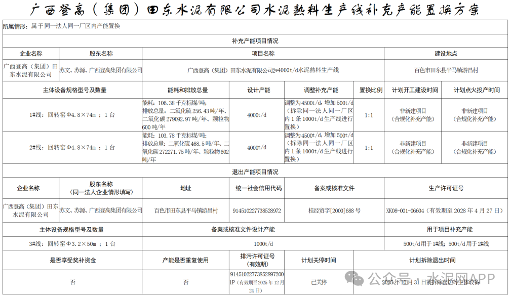 廣西登高(集團(tuán))田東水泥1#、2#4000t/d生產(chǎn)線各補充產(chǎn)能500t/d,退出產(chǎn)能來自同公司3#1000生產(chǎn)線,置換比例1:1。