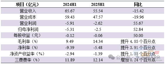 其他指標方面,上半年綜合毛利率錄得14.34%,比去年同期提升4.85個百分點;盡管凈資產(chǎn)收益率仍為負值,但較去年同期明顯好轉(zhuǎn),達到-1.39%。由于營業(yè)收入降幅較大,公司三費費率小幅增加0.24個百分點至12.14%。