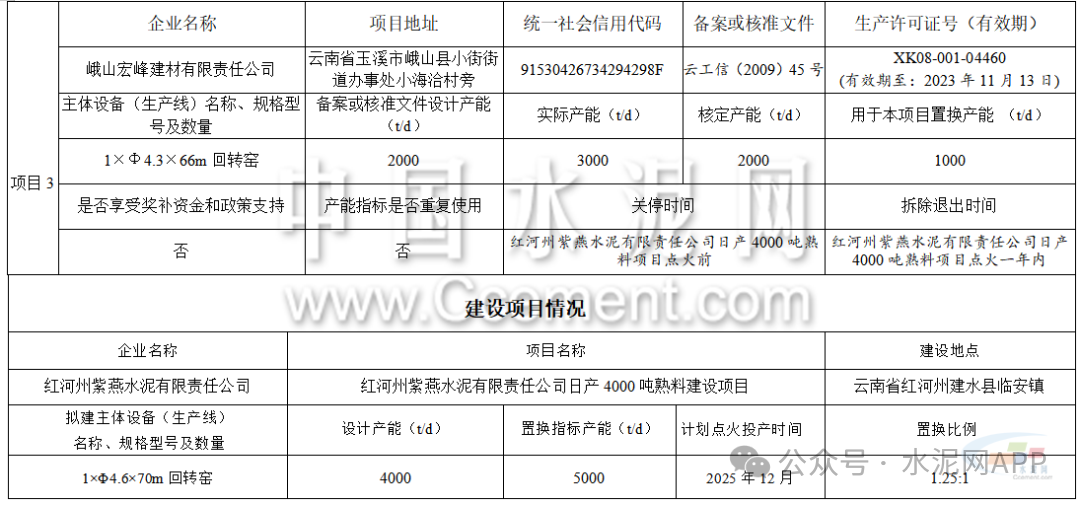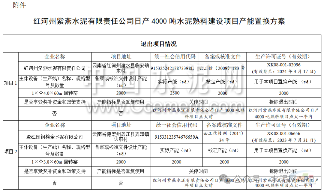 9月11日,云南省工信廳發(fā)布第18號、第19號公告。因故未實施,紅河州紫燕水泥有限責任公司申請撤銷“紅河州紫燕水泥有限責任公司日產(chǎn)4000噸水泥熟料建設(shè)項目產(chǎn)能置換方案”。按照原計劃,該企業(yè)擬建一條4000t/d熟料生產(chǎn)線項目,退出紅河州紫燕水泥有限責任公司2000t/d、盈江昆鋼榕全水泥有限公司2000t/d、峨山宏峰建材有限責任公司2000t/d共計3條生產(chǎn)線。