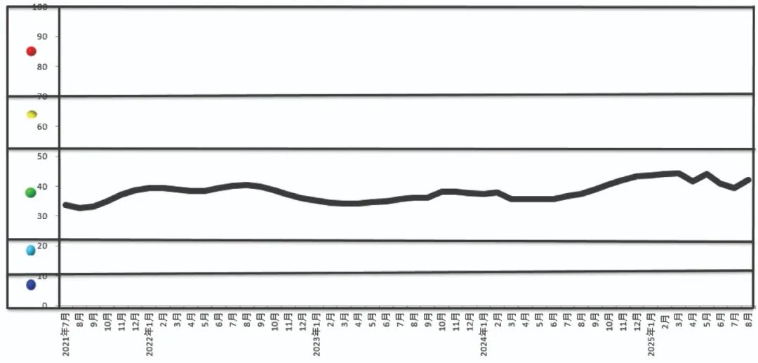 8月份,中國(guó)銅產(chǎn)業(yè)月度景氣指數(shù)為42.0,較上月上升2.7個(gè)百分點(diǎn),繼續(xù)保持在 “正?!?區(qū)間運(yùn)行。中國(guó)銅產(chǎn)業(yè)月度景氣指數(shù)變化趨勢(shì)如圖1所示。