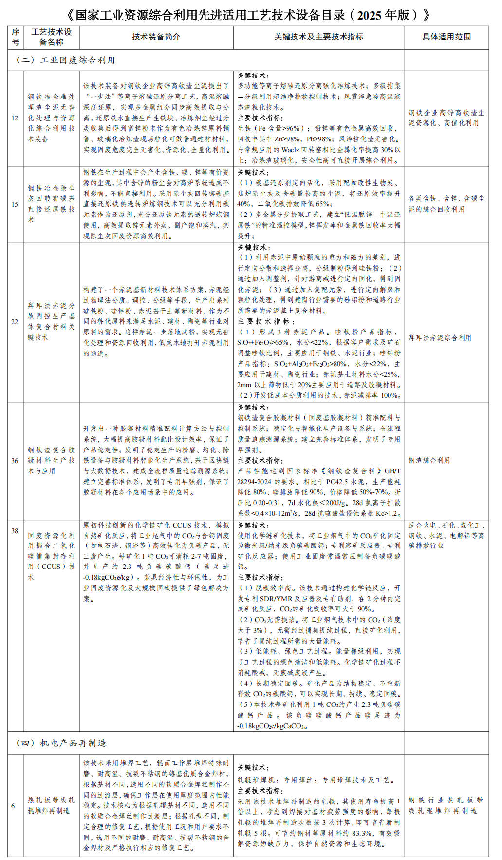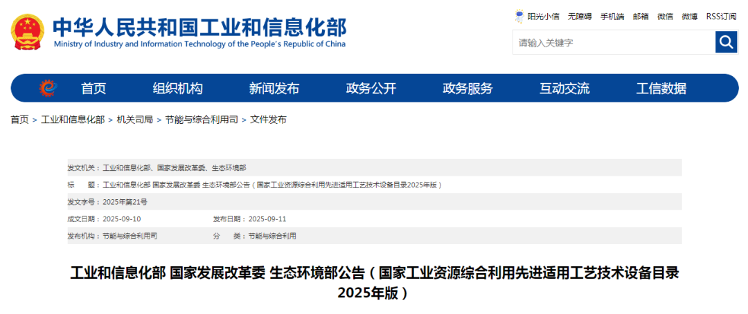 9月11日,為加快推動(dòng)工業(yè)固廢源頭減量和規(guī)?;茫嵘偕Y源綜合利用水平,發(fā)展高端智能再制造,工業(yè)和信息化部、國家發(fā)展改革委、生態(tài)環(huán)境部編制了《國家工業(yè)資源綜合利用先進(jìn)適用工藝技術(shù)設(shè)備目錄(2025年版)》,于工信部官網(wǎng)進(jìn)行了公示。
