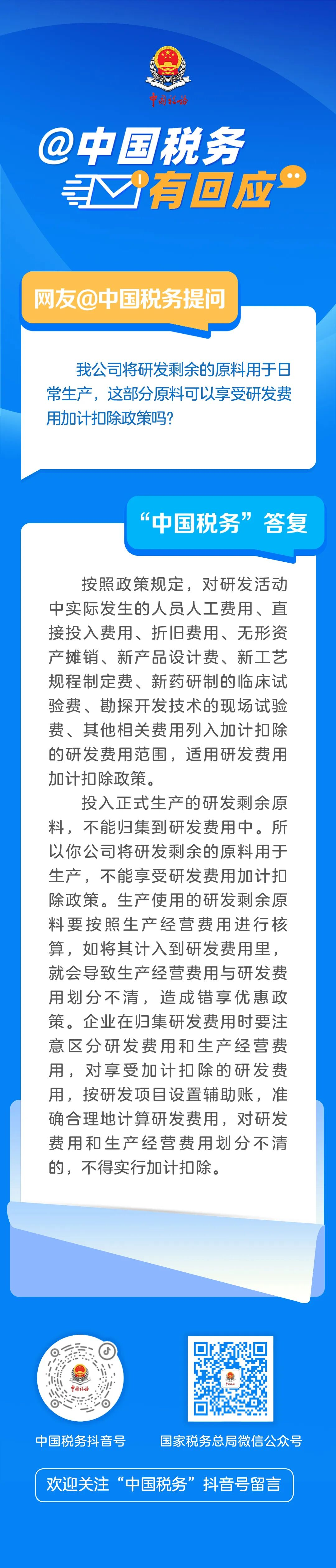 有網(wǎng)友問(wèn):“我公司將研發(fā)剩余的原料用于日常生產(chǎn),這部分原料可以享受研發(fā)費(fèi)用加計(jì)扣除政策嗎?”一起來(lái)看看回復(fù)吧↓
