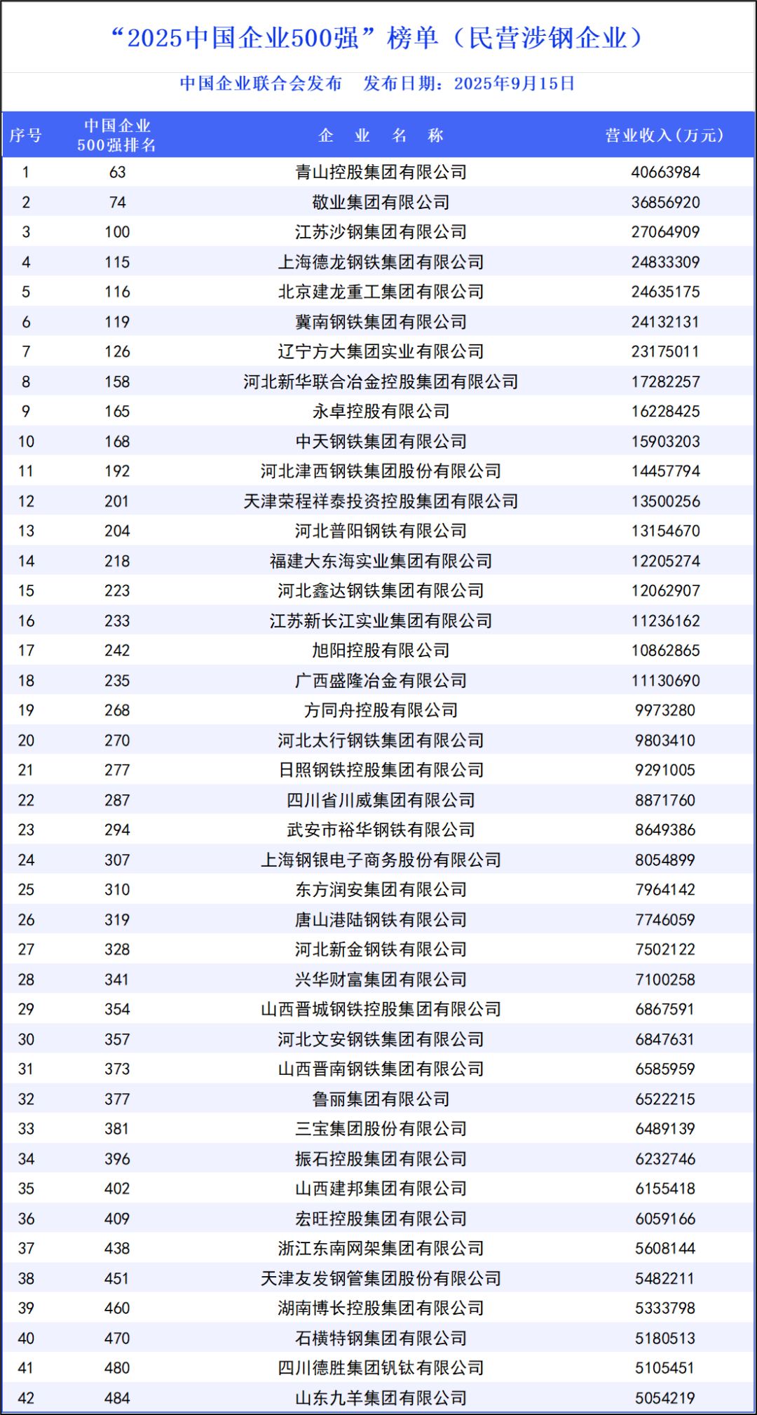 9月15日,中國企業(yè)聯(lián)合會(huì)發(fā)布了“2025中國企業(yè)500強(qiáng)”榜單。這是中國企聯(lián)連續(xù)第24次向社會(huì)發(fā)布該榜單。其中42家民營涉鋼企業(yè)上榜“2025中國企業(yè)500強(qiáng)”。排在“2025中國企業(yè)500強(qiáng)”前十位的民營鋼鐵企業(yè)有:青山控股集團(tuán)有限公司,敬業(yè)集團(tuán)有限公司,江蘇沙鋼集團(tuán)有限公司,上海德龍鋼鐵集團(tuán)有限公司,北京建龍重工集團(tuán)有限公司,冀南鋼鐵集團(tuán)有限公司,遼寧方大集團(tuán)實(shí)業(yè)有限公司,河北新華聯(lián)合冶金控股集團(tuán)有限公司,永卓控股有限公司,中天鋼鐵集團(tuán)有限公司。