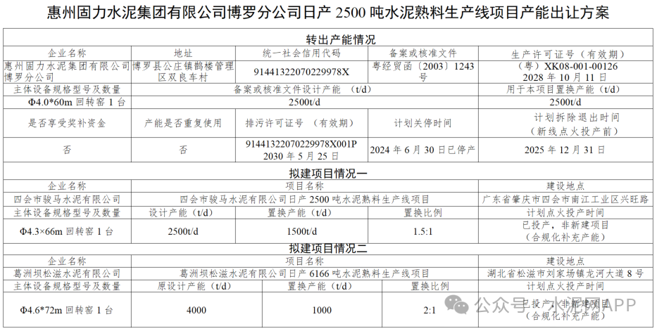 產(chǎn)能置換方案顯示,惠州固力水泥集團有限公司博羅分公司轉出一條2500t/d熟料產(chǎn)能,其中1500t/d產(chǎn)能用于補充四會市駿馬水泥生產(chǎn)線,1000t/d產(chǎn)能用于補充葛洲壩松滋水泥生產(chǎn)線。
