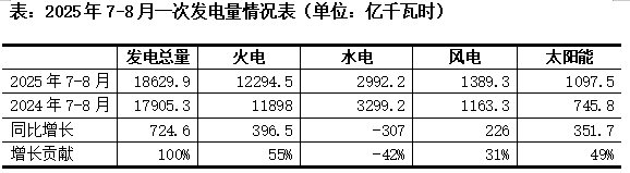 ★新能源替代效應大為增強七、八月份,與火電裝機容量基本相當?shù)男履茉闯隽φ敃r,風電、太陽能發(fā)電等新能源裝機的新增發(fā)電量不僅彌補了水電下降帶來的供應缺口,還在很大程度上滿足了全社會用電量增長的需求(同比增長3.7%)。這從國家統(tǒng)計局發(fā)布的一次發(fā)電量情況表中可以清楚的看出來。