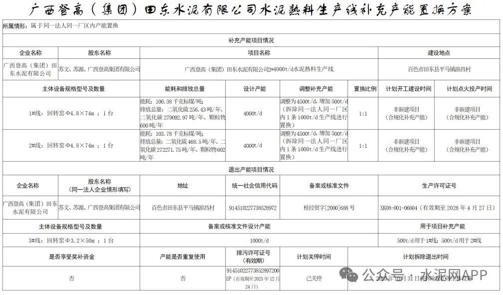 方案顯示,廣西登高(集團)田東水泥1#、2#4000t/d生產(chǎn)線各補充產(chǎn)能500t/d,退出產(chǎn)能來自同公司3#1000生產(chǎn)線,置換比例1:1。