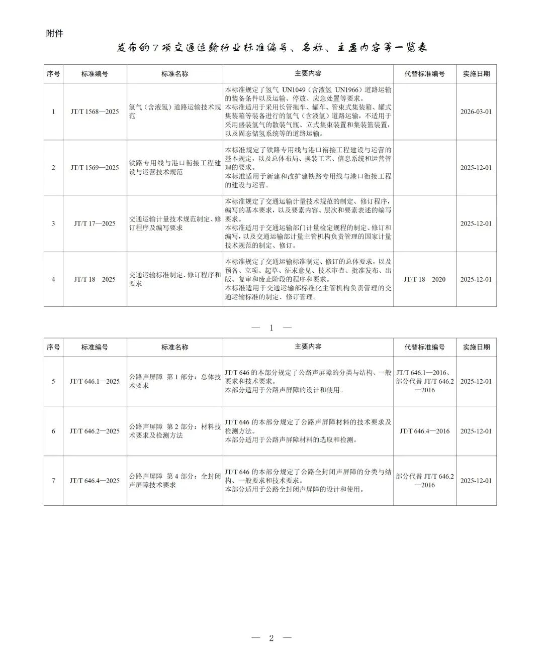 附件:發(fā)布的7項(xiàng)交通運(yùn)輸行業(yè)標(biāo)準(zhǔn)編號(hào)、名稱、主要內(nèi)容等一覽表