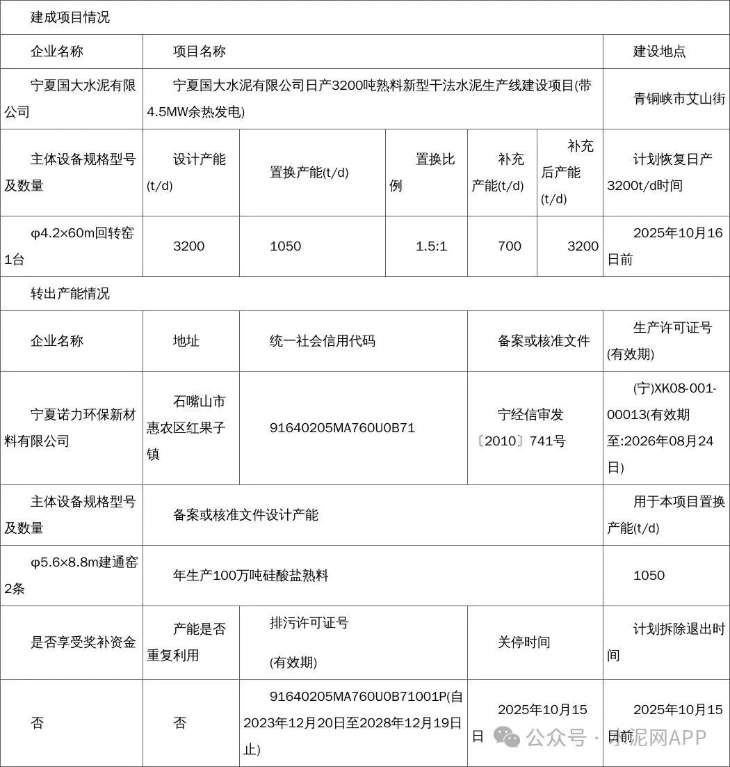 9月29日,寧夏回族自治區(qū)工業(yè)和信息化廳發(fā)布公告,按照工業(yè)和信息化部《水泥玻璃行業(yè)產(chǎn)能置換實(shí)施辦法(2024年本)》(工信部原〔2024〕206號(hào))有關(guān)要求,經(jīng)現(xiàn)場(chǎng)核查驗(yàn)收,寧夏諾力環(huán)保新材料有限公司產(chǎn)能出讓轉(zhuǎn)移至寧夏國大水泥有限公司的水泥熟料生產(chǎn)線,主體設(shè)備已拆除,不具備恢復(fù)生產(chǎn)熟料能力,現(xiàn)予公告。
