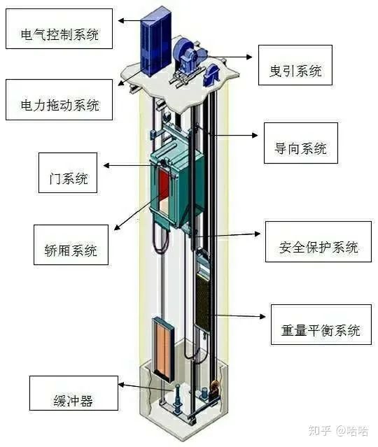 一、曳引系統(tǒng):電梯曳系統(tǒng)的功能是輸出動力和傳遞動力,驅(qū)動電梯運行。主要由曳引機,曳引鋼絲繩,導(dǎo)向輪和反繩輪組成。拽引機為電梯的運行提供動力,由電動機,拽引輪,連軸器,減速箱,和電磁制動器組成。拽引鋼絲的兩端分別連轎廂和對重,依靠鋼絲繩和拽引輪之間的摩擦來驅(qū)動轎廂升降。導(dǎo)向輪的作用是分開轎廂和對重的間距,采用復(fù)繞型還可以增加拽引力。