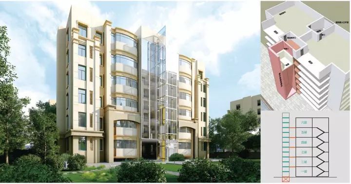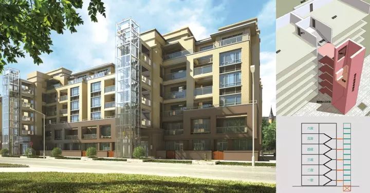 樓梯轉(zhuǎn)角處上下打通并重新改造成旋轉(zhuǎn)樓梯銜接上下層樓梯,電梯轎廂設(shè)置在室內(nèi)休息平臺空間,直接到達目的樓層。